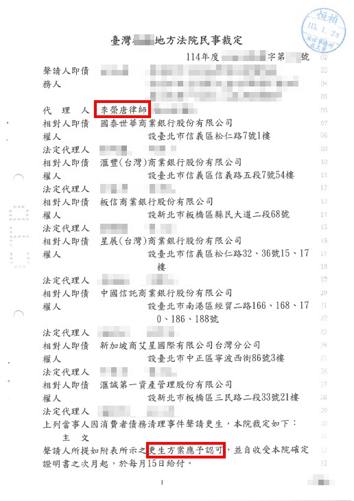 由李榮唐律師著手承辦後,根據消費者債務清理條例,向法院聲請更生程序,